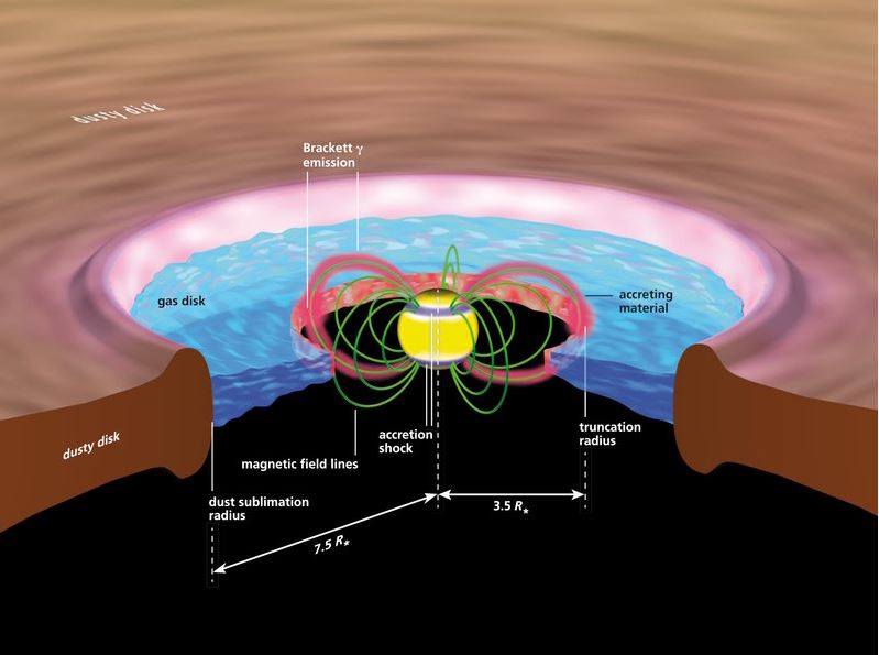 Тридцать лет назад Макс Камензинд предложил элегантное решение этой проблемы: в процессе магнитосферной аккреции магнитные поля молодого звездного объекта направляют газ от внутреннего края околозвездного диска к поверхности в виде отчетливых потоков, помогая ему терять угловой момент и перетекать на звезду. В самом простом сценарии газ от внутреннего края диска будет направлен на магнитные полюса звезды.