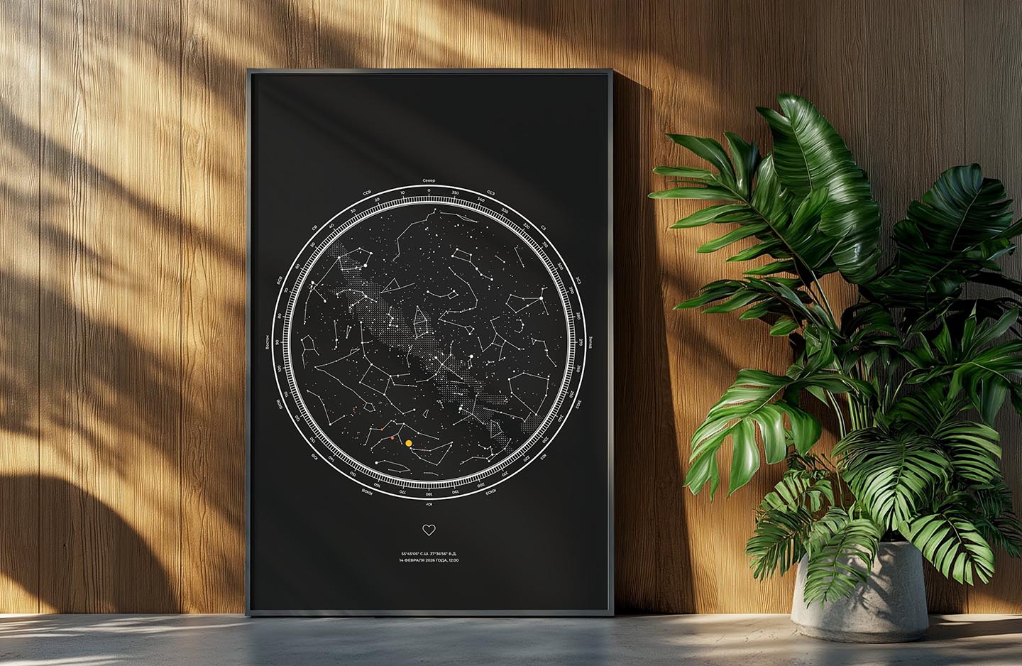 Каждая карта звездного неба – это маленькое окно в тот момент и то место, когда и где происходило важное для вас событие. Правильное положение звезд и планет, линии созвездий создают ощущение живого неба прямо перед глазами. Она позволяет снова ощутить атмосферу того дня, увидеть знакомые силуэты звезд и погрузиться в красоту космоса. Такая карта – не просто изображение: это воспоминание, которое остается с вами навсегда.