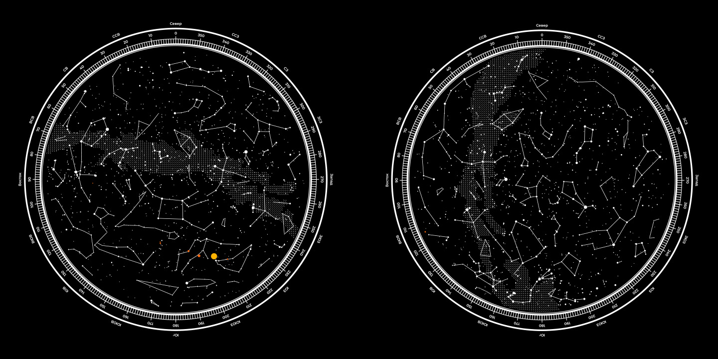 Представьте, что вы стоите лицом на север и держите карту звездного неба прямо над головой. Чтобы она правильно показывала небо, карту нужно развернуть так, чтобы ее верхняя часть была направлена на север. В этом положении восток окажется справа, а запад — слева. Такая ориентация точно отражает движение звезд и планет: они «встают» на востоке и «садятся» на западе, как это происходит в реальном небе.