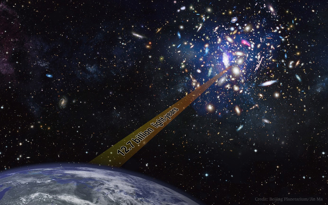 Используя телескопы ALMA и APEX, астрономы заглянули в самую глубь Вселенной, во времена, когда ее возраст составлял лишь одну десятую нынешнего, и увидели зарождение гигантского галактического скопления: массового столкновения молодых галактик, в которых происходят вспышки звездообразования. Свет от этого объекта начал свое путешествие к нам, когда возраст Вселенной составлял не более 1,4 миллиарда лет.
